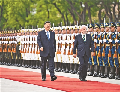 5月13日下午,国家主席习近平在北京人民大会堂同来华进行国事访问的巴西总统卢拉举行会谈。这是会谈前,习近平在人民大会堂东门外广场为卢拉举行欢迎仪式。