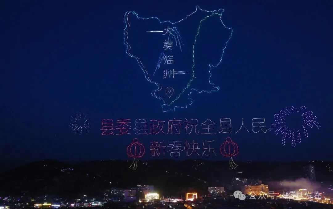 焰火中场,第二轮无人机表演精彩继续。碛口古镇轮廓幻化为腾空巨龙,寓意文旅产业迎来腾飞新机遇;东山康养、文体中心等画面彰显民生福祉不断提升;“万马奔腾”压轴呈现,象征全县上下凝心聚力、奋勇争先的精神风貌。