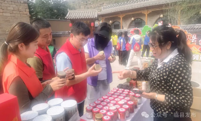 健步走活动根据沿途线路地形条件,分别设置打卡点,宣传介绍临县18个乡村旅游重点村和临县文创产品、土特产品、旅游景点、乡村振兴、产业发展等。邀请了18个村的支部书记、第一书记或村内形象代表参与每个村打卡点的宣传推介,还聘请知名网红全程跟进自媒体直播。与此同时,在碛口古镇,吕梁市电子商务协会在碛口古镇举办“庆丰收、品乡味,碛口古镇丰收季以旅促农——吕梁山土特产展销活动”。在碛口古镇中市街广场布置吕梁山土特产主展区、非遗工坊展区和特色体验综合展区,生动展示吕梁农耕文化、非遗技艺与碛口商驿文化的融合魅力。