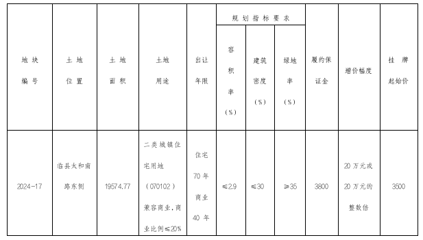 10、本次挂牌出让的详细资料和具体要求,见挂牌出让须知及其他出让文件(挂牌出让须知及其他出让文件可从网上交易系统查看和下载)。竞买人在竞买前须认真实地察看并全面阅读有关挂牌文件,如有异议,应当在提交竞买申请前向临县自然资源局提出书面意见。申请一经提交后,即视为竞买人对挂牌文件及宗地现状无异议并全部接受,并对有关承诺承担法律责任。临县自然资源局不承担瑕疵担保责任。
