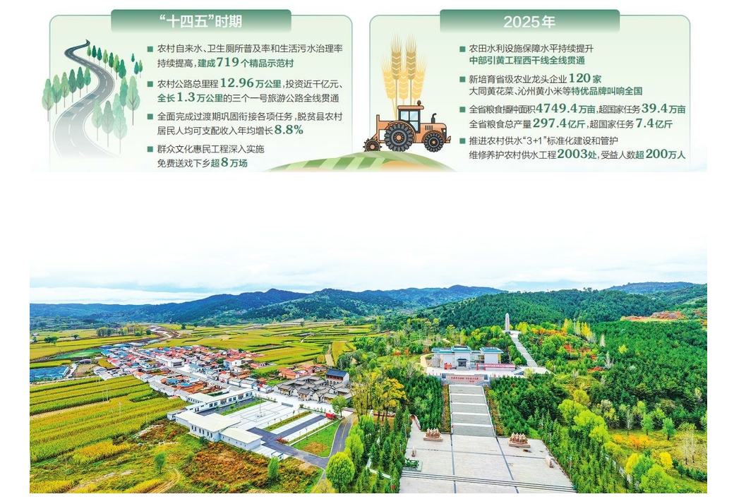 政府工作报告提出,扎实推进乡村全面振兴。坚持把“三农”工作作为重中之重,深入学习运用“千万工程”经验,提高强农惠农富农政策效能,进一步夯实农业农村基础、提升发展质效。当前,山西正不折不扣落实党中央部署的“三农”工作各项任务,锚定目标、砥砺奋进,扎实推动乡村全面振兴取得新进展、农业农村现代化再上新台阶。