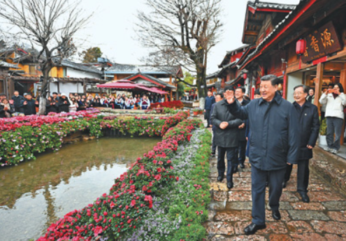 丽江古城有800多年历史,被列入世界文化遗产名录。一场春雪过后,丽江游人如织。习近平来到这里,详细了解古城营建历史、纳西族民居特色和当地文化遗产保护利用、推动文旅融合发展等情况。居民和游客见到总书记十分兴奋,争相问好,有的还弹奏乐器、载歌载舞欢迎总书记。习近平频频与大家互动交流,了解商铺经营状况和游客感受。他要求当地处理好保护和发展的关系,让这座美丽的古城焕发新的光彩。