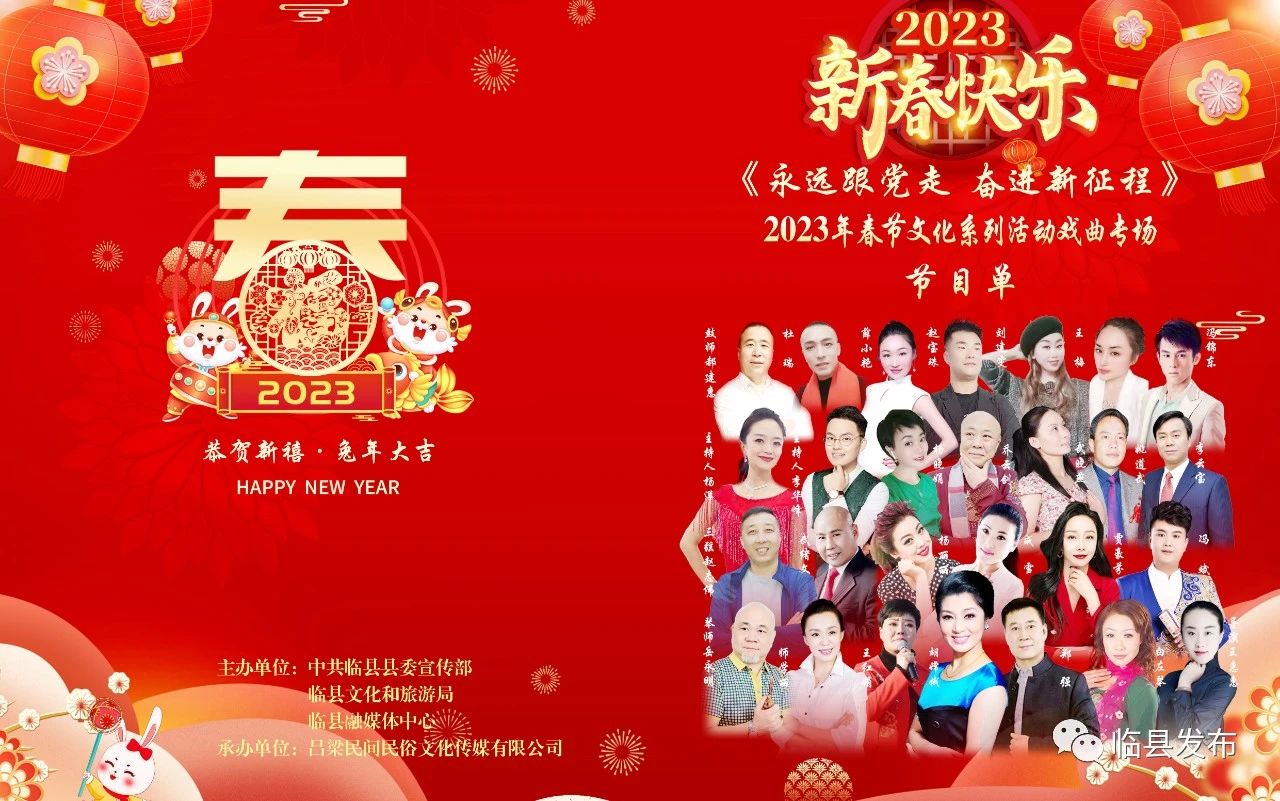 过大年,赏大戏。为弘扬传统戏曲艺术,传承文化经典,营造浓厚的春节氛围,满足市民文化生活需求,2月2日晚,由临县县委宣传部、临县文化和旅游局、临县融媒体中心主办,吕梁民间民俗文化传媒有限公司承办的“永远跟党走 奋进新征程”2023年春节文化系列活动戏曲专场直播晚会在县影剧院激情上演。晚会邀请众戏曲名家助兴演出,16个精彩节目给全县人民群众奉献了一场精美的“文艺大餐”。