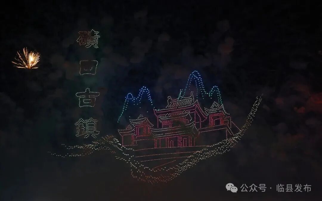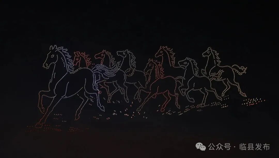 焰火中场,第二轮无人机表演精彩继续。碛口古镇轮廓幻化为腾空巨龙,寓意文旅产业迎来腾飞新机遇;东山康养、文体中心等画面彰显民生福祉不断提升;“万马奔腾”压轴呈现,象征全县上下凝心聚力、奋勇争先的精神风貌。