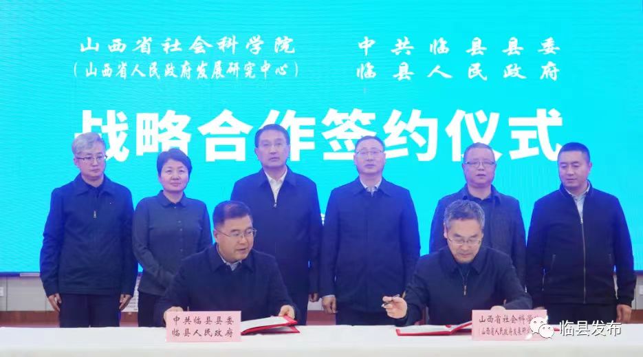 12月4日,临县与省社科院(省政府发展研究中心)战略合作签约仪式在临县宾馆二楼会议室举行。省社科院(省政府发展研究中心)党组书记、院长张峻,党组成员、副院长赵文江,临县县委书记范亮珍,县委常委、常务副县长高云林,县委常委、宣传部部长王桂秀,政府副县长杨勇出席仪式。