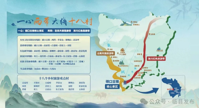 启动仪式上,发布和推介了临县“一心两带六线十八村”精品旅游线路。一心是以碛口古镇景区为核心;两带是沿黄风情旅游带和湫川红色旅游带;六线是历史文化名镇名村线路:碛口古镇—西湾—李家山—寨则山—高家坪;沿黄观光线路:碛口古镇—高家塔—白道峪—岩窑上—开阳;红色研学线路:高家塔—寨则山—寨则坪—南圪垛—双塔—孙家沟—杜家圪垛;休闲乡村线路:垣上—尧昌里—白家山—孙家沟—东王家沟—青塘—五和居;民俗文化体验线路:碛口古镇—义居寺—东王家沟—正觉寺(十二连城)—开阳—白道峪—丛罗峪真武山;生态康养线路:汉高山—紫金山—大度山。十八个乡村旅游重点村分别是高家塔、开阳村、白道峪、李家山、寨则山、孙家沟、西湾、寨则坪、岩窑上、南圪垛、双塔、杜家圪垛、青塘、垣上、白家山、东王家沟、尧昌里、五和居。