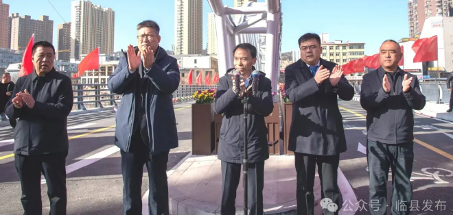 仪式现场氛围热烈,临县胜利煤焦负责人分享了企业参与项目建设的责任担当。王俊杰在致辞中,向为大桥建设倾注心血的设计者、建设者及全体参与者致以崇高敬意。他表示,水门桥的建成通车,是一个崭新的起点。希望各部门继续发扬在项目建设中锤炼的优良作风,以此为契机,统筹谋划、持续推进一批打基础、利长远、惠民生的优质项目。也衷心希望广大企业和社会各界人士一如既往地关心、支持、参与临县的建设与发展。让我们携手并肩、接续奋斗,以更加昂扬的斗志、更加务实的作风,合力共建美丽幸福临县!