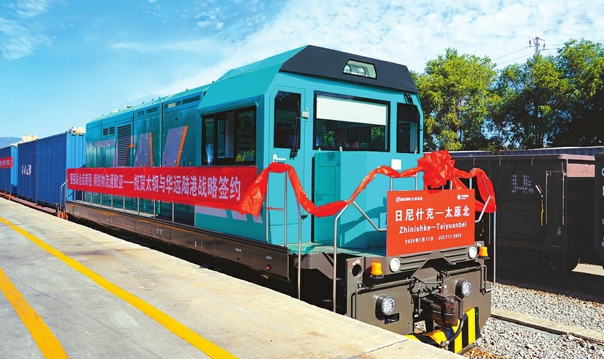 2025年7月17日,一列中欧(亚)班列驶入太钢集团采购中心仓储作业区站台线。