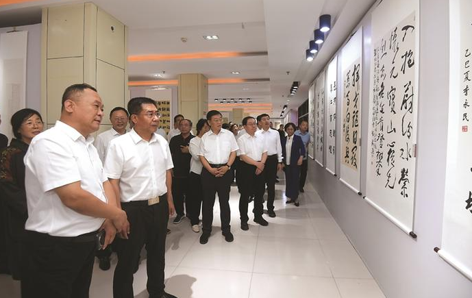 图为市委书记孙大军等市领导观看吕梁市纪念中国人民抗日战争暨世界反法西斯战争胜利八十周年书法作品展。