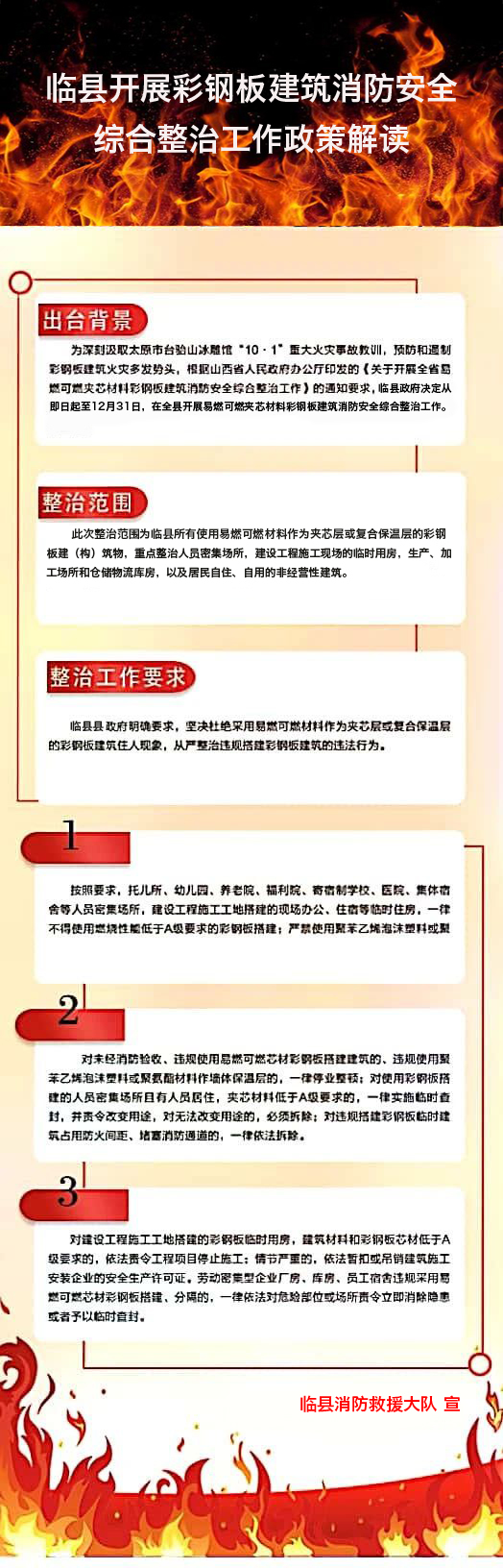 【图解】临县消防救援大队关于《临县易燃可燃夹芯材料彩钢板建筑消防安全综合整治工作实施方案的通知》的解读