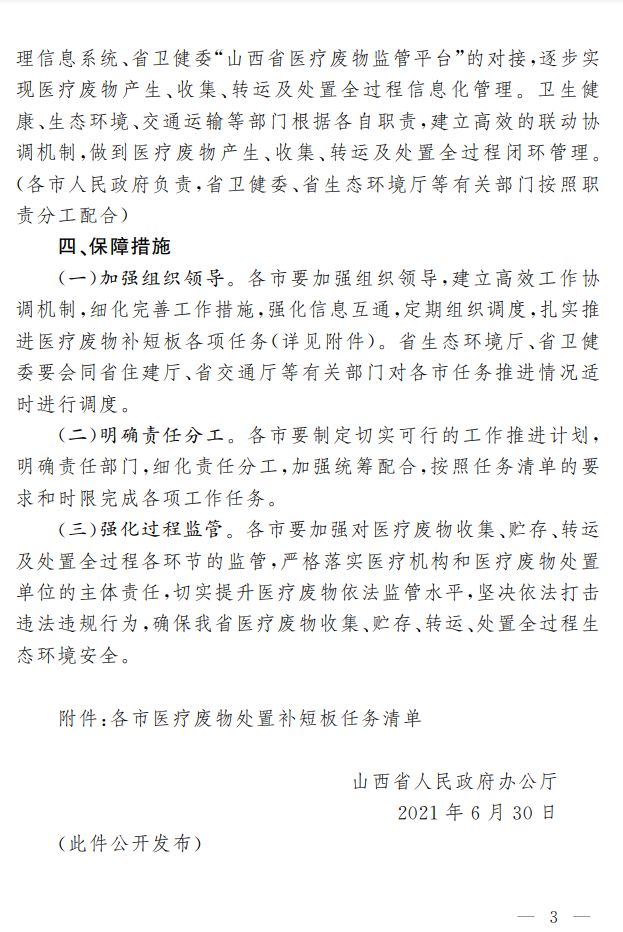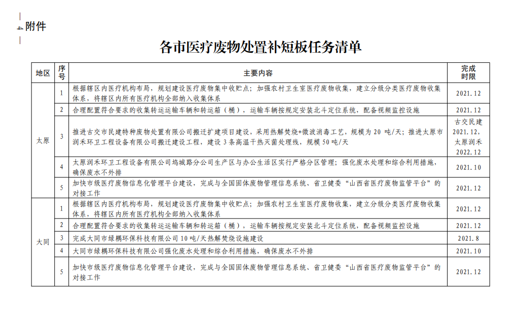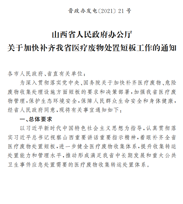 山西省人民政府办公厅关于加快补齐我省医疗废物处置短板工作的通知