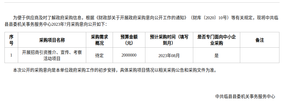 中共临县县委机关事务服务中心2023年7月政府采购意向
