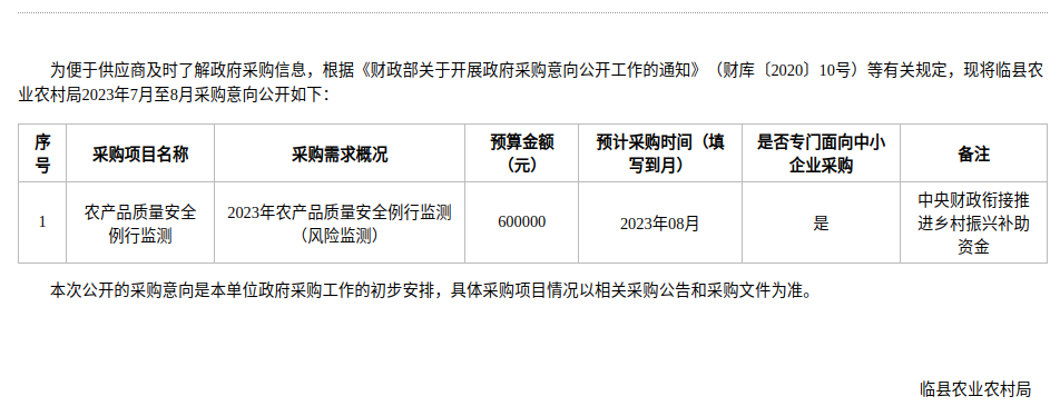 临县农业农村局2023年7月至8月政府采购意向