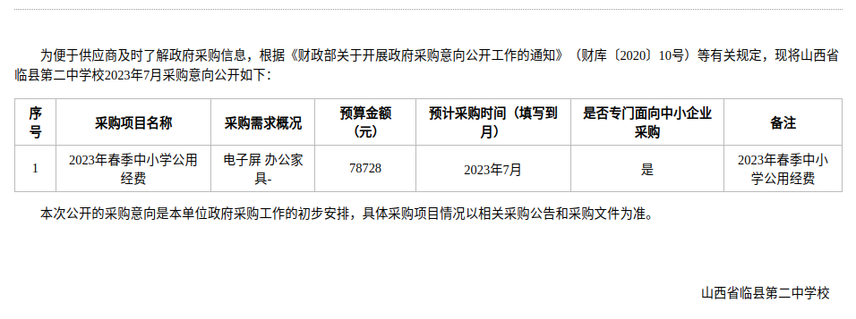 山西省临县第二中学校2023年7月政府采购意向
