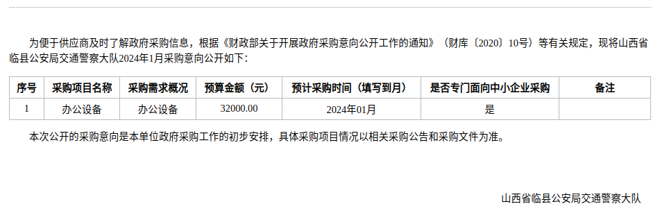 山西省临县公安局交通警察大队2024年1月政府采购意向