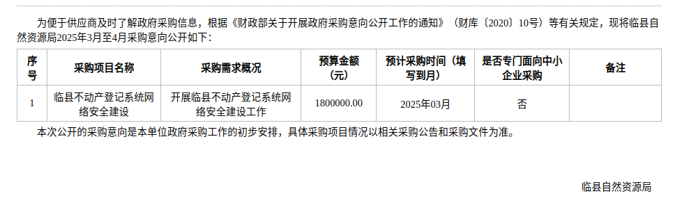 临县自然资源局2025年3月至4月政府采购意向