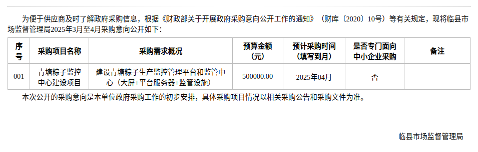 临县市场监督管理局2025年3月至4月政府采购意向