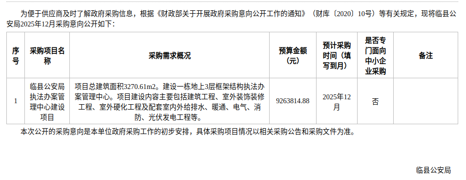 临县公安局2025年12月政府采购意向