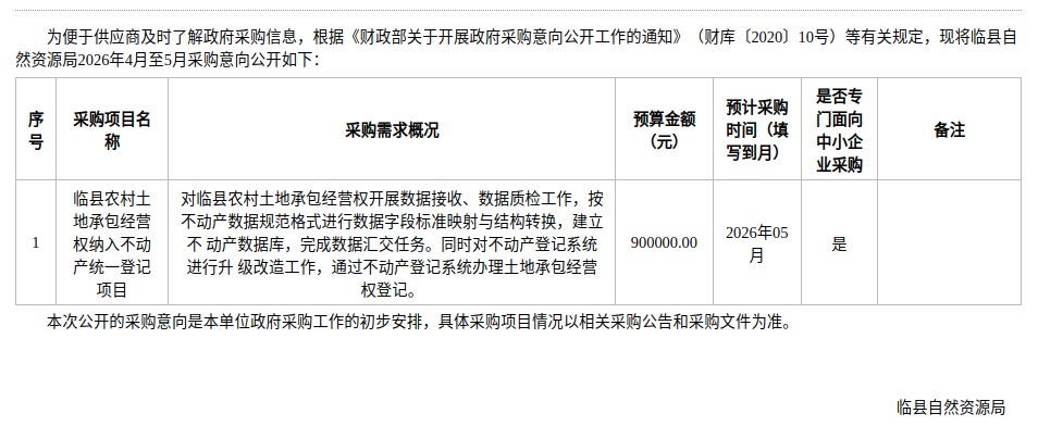 临县自然资源局2026年4月至5月政府采购意向